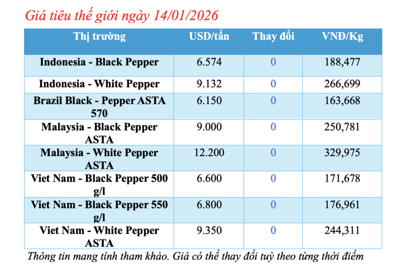 Cập nhật giá tiêu thế giới từ Hiệp hội Hồ tiêu Quốc tế (IPC) sáng 14/01/2026, hồ tiêu xuất khẩu hôm nay không ghi nhận biến động mới. Các thị trường đều ổn định giá so với phiên giao dịch hôm qua.