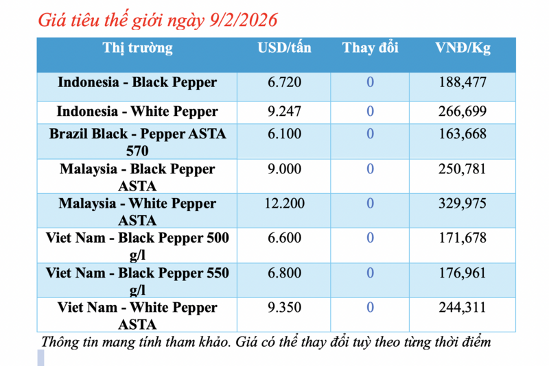 Giá tiêu thế giới hôm nay 9/2/2026: Không biến động