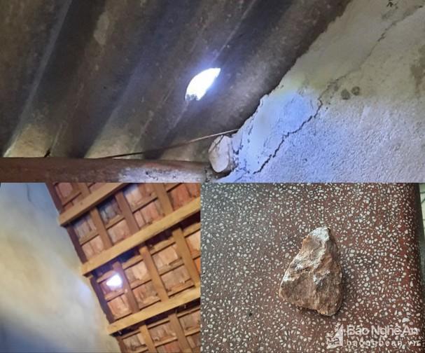 Cán bộ UBND xã Châu Tiến xác minh hiện trường tại nhà bà Phạm Thị Thành, bản Lầu bị đá văng vỡ ngói, vỡ kính ngày 31/5/2021. Ảnh:Ngọc Khánh