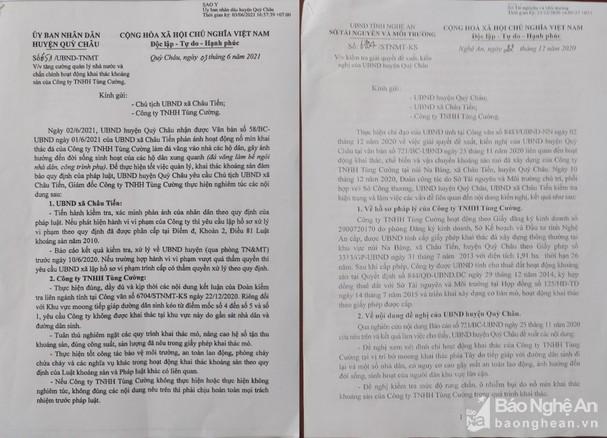 UBND huyện Quỳ Châu cũng gửi Văn bản số 651/UBND-TNMT đến Công ty TNHH Tùng Cường. Tại đây, UBND huyện Quỳ Châu yêu cầu Công ty TNHH Tùng Cường “Thực hiện đúng, đầy đủ và kịp thời các nội dung kết luận của Đoàn kiểm tra liên ngành tỉnh tại Công văn số 6704/STNMT-KS ngày 22/12/2020. Riêng đối với khu vực moong tiếp giáp đường dân sinh kéo từ điểm mốc số 4 đến số 5 và số 1, yêu cầu Công ty không được khai thác tại khu vực này do gần sát nhà dân và đường dân sinh. Tuân thủ nghiêm ngặt các quy trình khai thác…”.