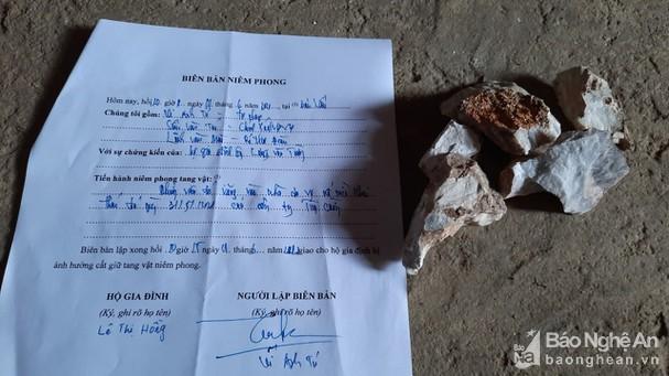 UBND xã Châu Tiến niêm phong vật chứng là các cục đá văng từ mỏ đá Công ty TNHH Tùng Cường làm vỡ ngói nhà dân. Ảnh: CSCC