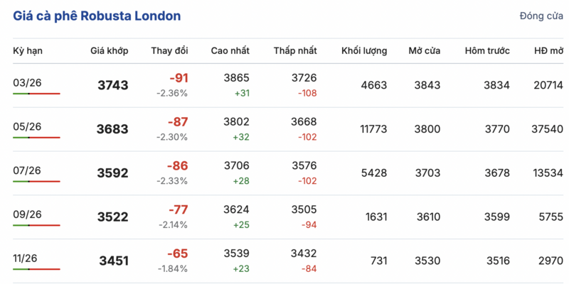 Kết thúc phiên giao dịch gần nhất, giá cà phê Robusta tại London đảo chiều giảm mạnh đồng loạt trong các kỳ giao hàng. Cụ thể, kỳ giao tháng 1/2026 giảm mạnh 91 USD/tấn, xuống mức 3743 USD/tấn. Trong khi đó, hợp đồng giao kỳ hạn tháng 11/2026 cũng giảm 65 USD/tấn, đạt mức 3451 USD/tấn.