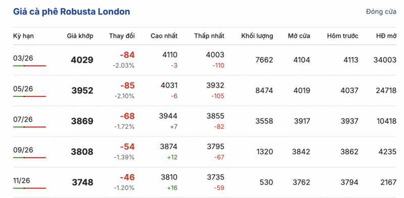 Kết thúc phiên giao dịch gần nhất, giá cà phê Robusta tại London tiếp tục sụt giảm đồng loạt trong các kỳ giao hàng. Cụ thể, kỳ giao tháng 1/2026 giảm đến 84 USD/tấn, xuống mức 4029 USD/tấn. Trong khi đó, hợp đồng giao kỳ hạn tháng 9/2026 cũng giảm nhẹ 46 USD/tấn, đạt mức 3748 USD/tấn.