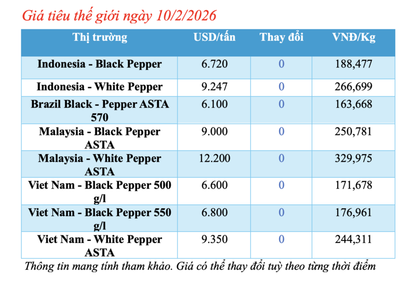 Giá tiêu thế giới hôm nay 10/2/2026: Đi ngang