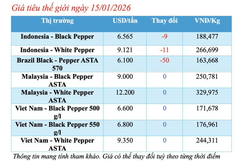 Cập nhật giá tiêu thế giới từ Hiệp hội Hồ tiêu Quốc tế (IPC) sáng 15/01/2026, hồ tiêu xuất khẩu hôm nay ghi nhận phiên sụt giảm tại thị trường Indonesia và Brazil.