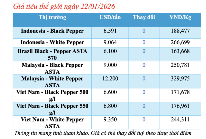 Cập nhật giá tiêu thế giới từ Hiệp hội Hồ tiêu Quốc tế (IPC) sáng 22/01/2026, hồ tiêu xuất khẩu hôm nay không ghi nhận biến động mới. Các thị trường đều duy trì mức giá ổn định so với phiên giao dịch hôm qua.