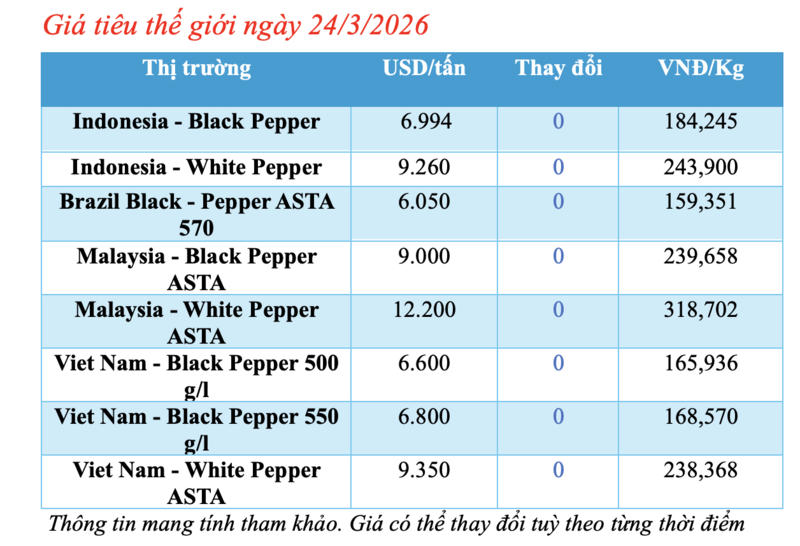 Cập nhật thị trường thế giới từ Hiệp hội Hồ tiêu Quốc tế (IPC) sáng 24/3, hồ tiêu xuất khẩu hôm nay không ghi nhận biến động mới. Các thị trường đều duy trì mức giá ổn định so với phiên giao dịch trước.