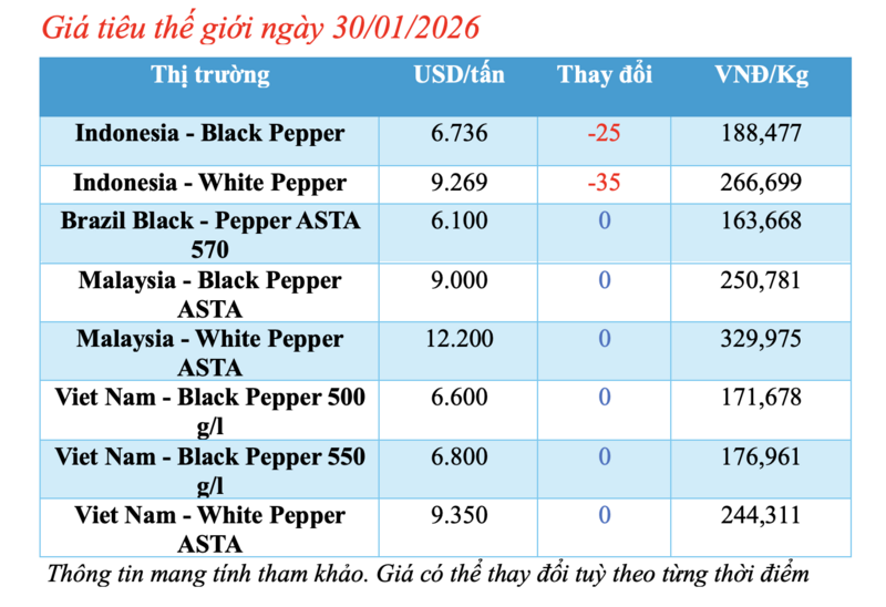 Cập nhật giá tiêu thế giới từ Hiệp hội Hồ tiêu Quốc tế (IPC) sáng 30/01/2026, hồ tiêu xuất khẩu hôm nay ghi nhận biến động mới từ thị trường Indonesia. Trong khi đó, các thị trường khác đều duy trì mức giá ổn định so với phiên giao dịch hôm qua.
