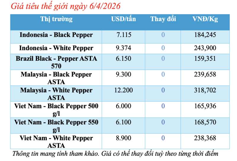 Cập nhật dữ liệu từ Hiệp hội Hồ tiêu Quốc tế (IPC) sáng 6/4/2026, hồ tiêu xuất khẩu hôm nay không ghi nhận biến động mới. Các thị trường xuất khẩu hồ tiêu lớn đều duy trì mức giá ổn định.
