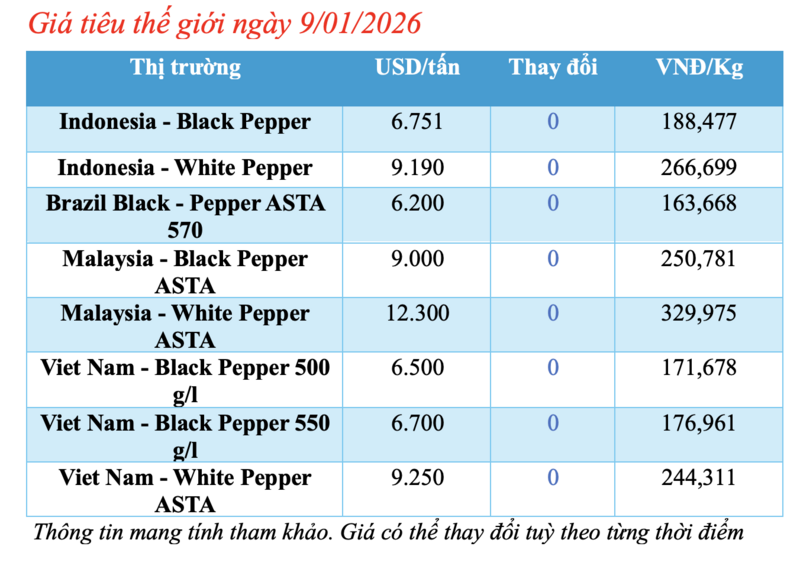Cập nhật giá tiêu thế giới từ Hiệp hội Hồ tiêu Quốc tế (IPC) sáng 9/01/2026, hồ tiêu xuất khẩu hôm nay không ghi nhận biến động mới. Các thị trường đều ổn định giá so với phiên giao dịch hôm qua.
