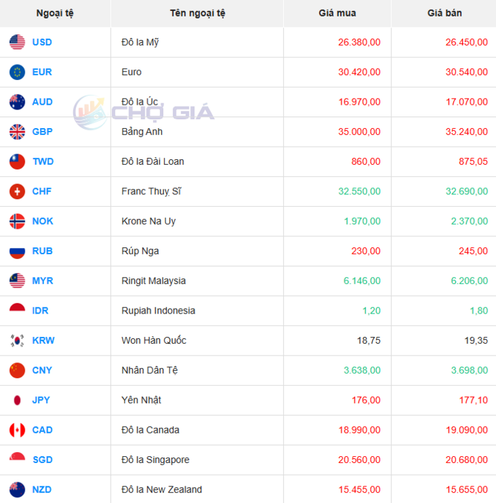 Cụ thể, tại ngân hàng Vietcombank, tỷ giá USD là 25.950 - 26.340 đồng/USD, không đổi ở cả 2 chiều, so với phiên giao dịch ngày hôm qua.