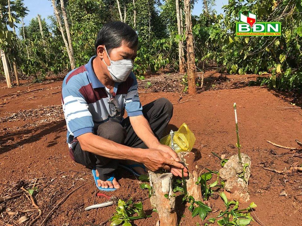 Ông Nguyễn Văn Vinh, xã Trường Xuân (Đắk Song), sử dụng giống cà phê dây để ghép cải tạo vườn cà phê già cỗi |