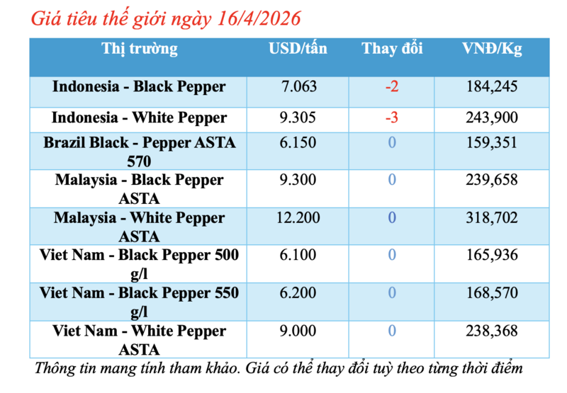 Cập nhật dữ liệu từ Hiệp hội Hồ tiêu Quốc tế (IPC) sáng 16/4/2026, hồ tiêu xuất khẩu hôm nay tiếp tục ghi nhận phiên giảm nhẹ từ thị trường Indonesia. Đây là phiên giảm thứ ba liên tiếp tại thị trường này. Trong khi đó, các thị trường xuất khẩu hồ tiêu lớn khác đều duy trì mức giá ổn định.