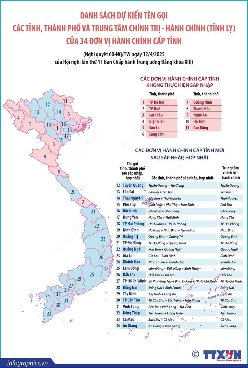 Tên gọi dự kiến của 34 đơn vị hành chính cấp tỉnh sau sáp nhập, hợp nhất