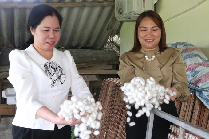 Bà Triệu Thị Bích Liệu (phải) – Trưởng phòng NN-PTNT huyện Trấn Yên tham quan sản phẩm kén mới thu hoạch của nông dân xã Quy Mông. Ảnh: Thanh Tiến.
