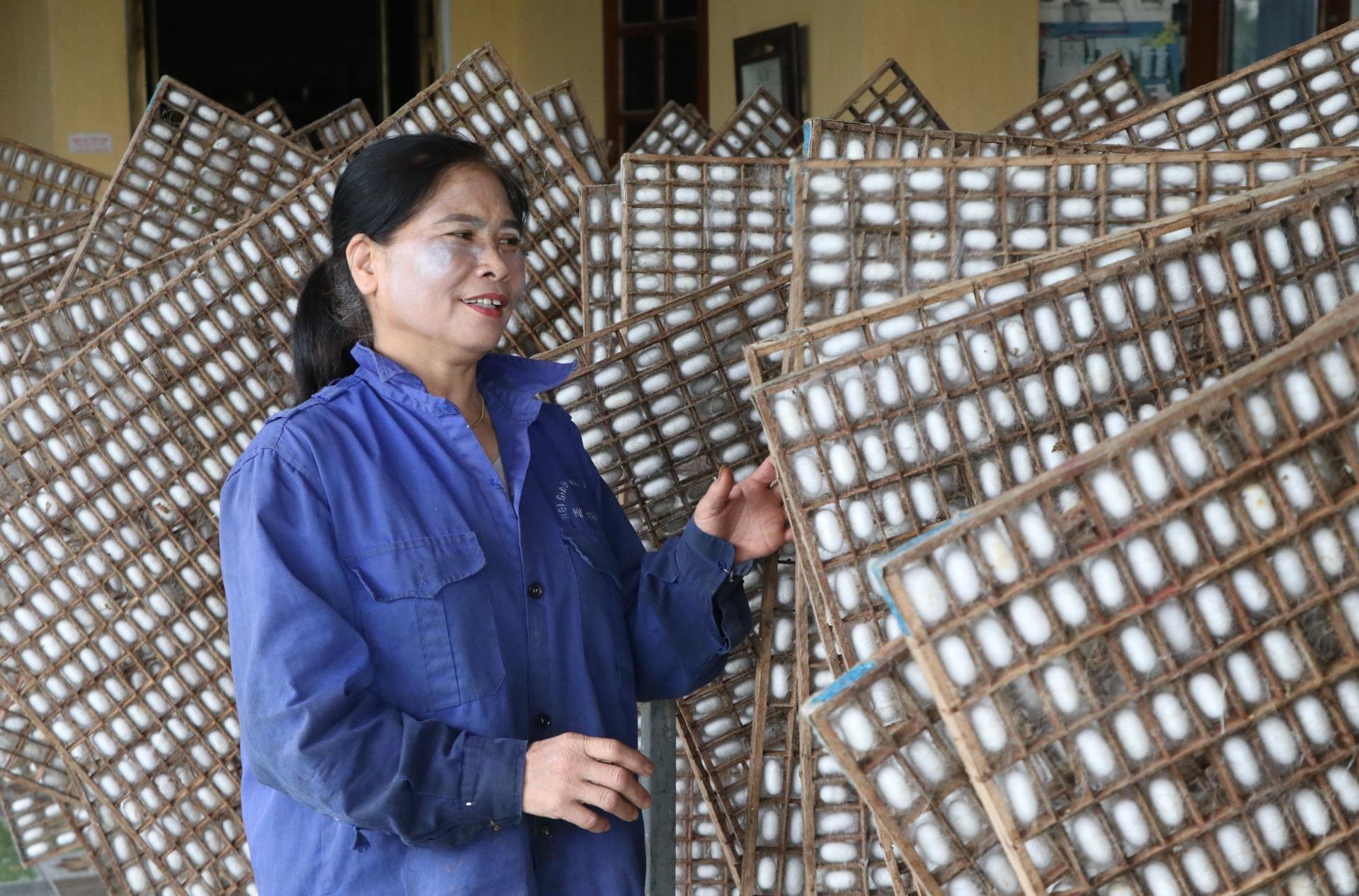 Bà Nguyễn Thị Tính phấn khởi bên những né kén tằm chuẩn bị thu hoạch. Ảnh: Thanh Tiến.