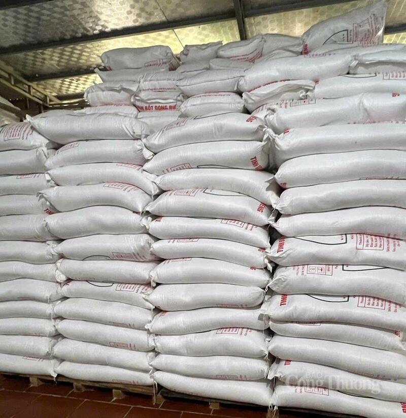 Nguyên liệu bột dong được đóng bao, bảo quản cẩn thận tại cơ sở sản xuất, phục vụ quy trình chế biến miến làng So. Ảnh: Lê Hà