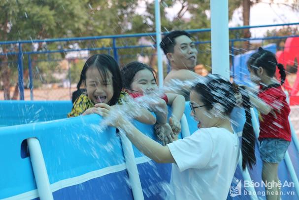 Học sinh và phụ huynh huyện Nghi Lộc vui mừng khi có bể bơi gần nhà và các em được thỏa mãn sở thích bơi lội. Ảnh: Mỹ Hà